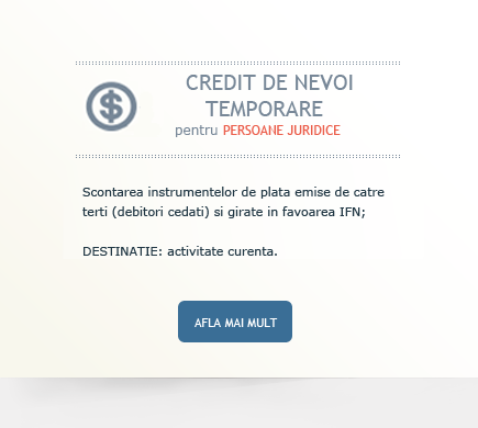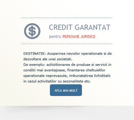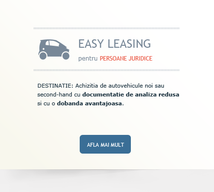 Portofoliul nostru de produse acopera solutii pentru leasing auto, leasing imobiliar, leasing de echipamente si credite: credit cu garantie imobiliara, credit ipotecar, credit pentru investitii, credit proiecte fonduri nerambursabile, credit punte, linie de credit.